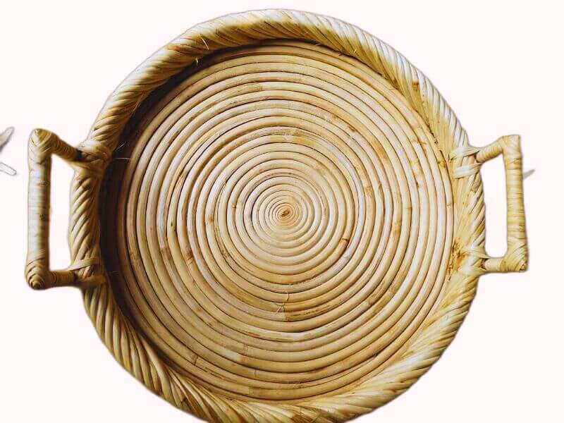 | Description | Handcrafted from natural cane and rattan, this round tray features a sturdy handle for easy portability. Woven by skilled artisans in Bangladesh, it combines rustic charm with practical function—ideal for serving snacks, organizing essentials, or displaying décor. The durable, lightweight design embodies sustainable craftsmanship, adding organic texture and artisanal elegance to any setting. |